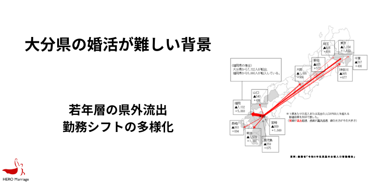 若年層の東京圏への転出超過(2024年:1,205人)で、県内の未婚母集団は年々減少しています。出会いの“分母”が少ないので、相手に求める条件を厳しくすると結婚することが難しいです。。 大分県ホームページ